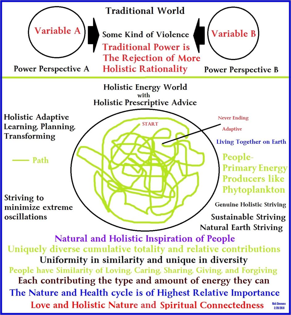 Natural Earth Striving harmony like Nature is a system where no energy is lost or wasted. Thus, we must be able to learn positive energy beneficial/benevolent things from nature, the Bible, philosophy, Humanity, and spirituality. Laws, rules, regulations, policies, procedures mostly come from pollution, negative energy, or anticipated pollution in a reactionary reductionist world. This pollution cycle creates more of the same pollution all the time. The result is more pollution, complexity, and controversy all the time. Hence, all this anthropogenic pollution is derived from anthropocentric extreme functioning that deviates far away from how God intended. In fact, Nature was put on our planet to provide for us and for us to learn from in terms of nurturing and energy flows etc. People must choose not to act like a vicious predator or a predacious snake. Instead, we must function like mutualists, symbiosis, and adapt like holistic ecological succession understanding these waste not positive energy flows and nurturing behavior above all. Competition is something to learn form in nature, but we must put it through our positive energy filters first as we are transitioning to a holistic inclusive humanity.