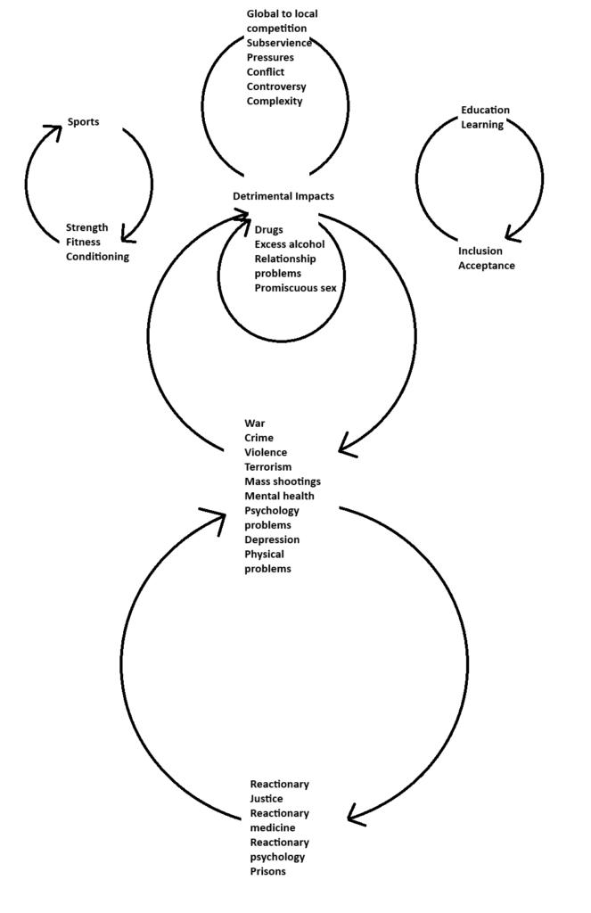 Subservience, pressures, conflict, controversy, fragmentation, and complexity manifest as impacts on people and on the natural and social environments. This is especially true when we have lack of holistic justice systems, environmental injustice, and social injustice People are affected by phenomena created by traditional society within organizations of all types. Excessive judging also affects people. The way I see it, there are three downwards spiral cycles involved in this concept. The inner cycle involves the types of medicine people use to feel better in our society when they’re being impaled by all kinds of negativity and stress. Types of medicine include drugs, excess, alcohol, promiscuity, and relationship problems. This cycle is a downward-spiral feedback loop that results in more and more of the same until an inflection point is reached. This inflection point manufactures more impacts, which result in crime, violence, terrorism, mass shootings, mental health problems, psychological problems, depression, and physical problems, which manifest themselves in another cycle with reactionary justice, reactionary medicine, and reactionary psychology. So our society creates a concept of people who are detrimentally impacted. Everyone should have the chance to go to school, explore, live, learn, love, and be included and accepted in organizations, groups, and communities. However, these people too often get involved in hierarchical organizations and politics, which contributes to a detrimental impact on others. There is a top-down force that magnifies as you move down from the top, resulting in people at the bottom being affected more than those at the top. Therefore, the holistic, positive energy people tend to contribute to the negative energy and detrimental impacts by getting involved in traditional functioning. A lot has to do with extreme competition in our world and the extraction, exchange, and exclusion of people’s ideas and creativity, as well as their manual labor and energy. Too much credit is given to people at the top and not enough to people at the bottom or in the middle of the hierarchy. Therefore, it’s not anybody’s fault in particular, it’s kind of like the status quo of the way things are world. It harms people and creates negative-energy downward-spiral feedback loops, which contribute to more of the same. Consequently, I believe we all need to be treated as holistic, well-motivated, positive-energy people, and to restore health to those who have been impacted over time.